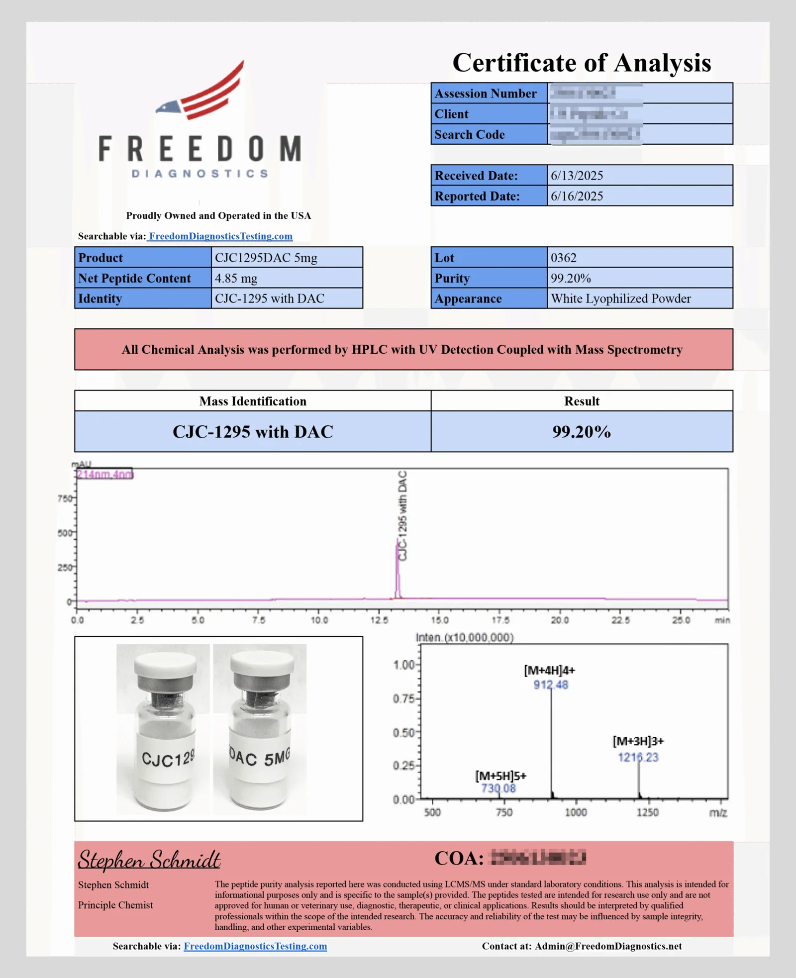 Every batch of CJC-1295 DAC is manufactured under strict quality control standards, achieving ≥99% purity verified through independent third-party testing. This guarantees safety, consistency, and research-grade performance.